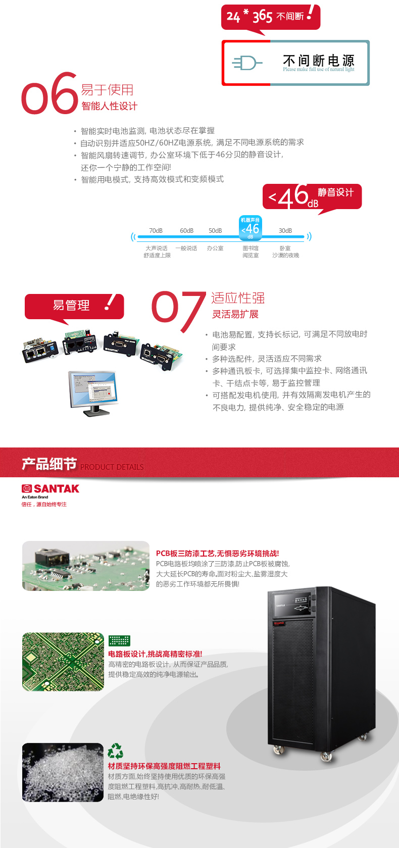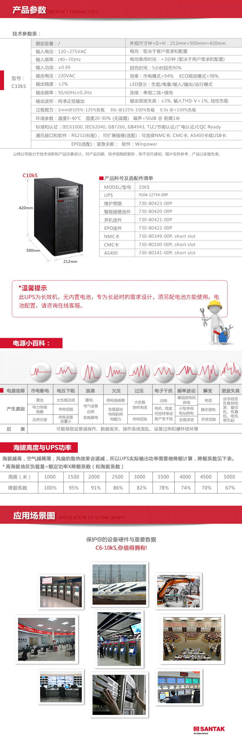 山特C10KS系列UPS---是一款继承上一代城堡系列UPS 的优秀品质,并在其基础上表现更加出色的双转换在线式UPS。在有效解决9 种电力问题(断电、市电电压过高或过低、电压瞬间跌落或减幅震荡、高压脉冲、电压波动、浪涌电压、谐波失真、杂波干扰、频率波动)的基础上,山特C10KS大幅提高了其在可靠性、高效性、适应性和灵活性等方面的表现,全方位满足了用户对稳定且不间断电力的需求。同时,其所具备的丰富的可扩展功能,也为满足用户的个性化需求提供了保障。