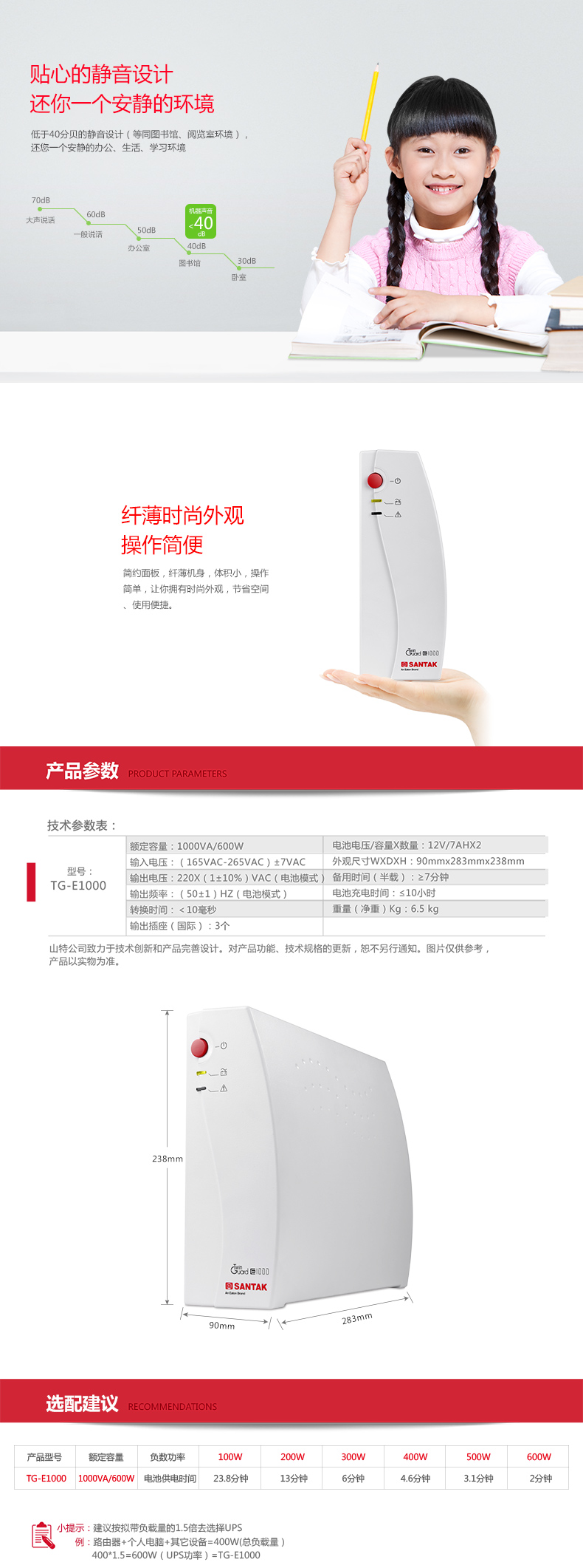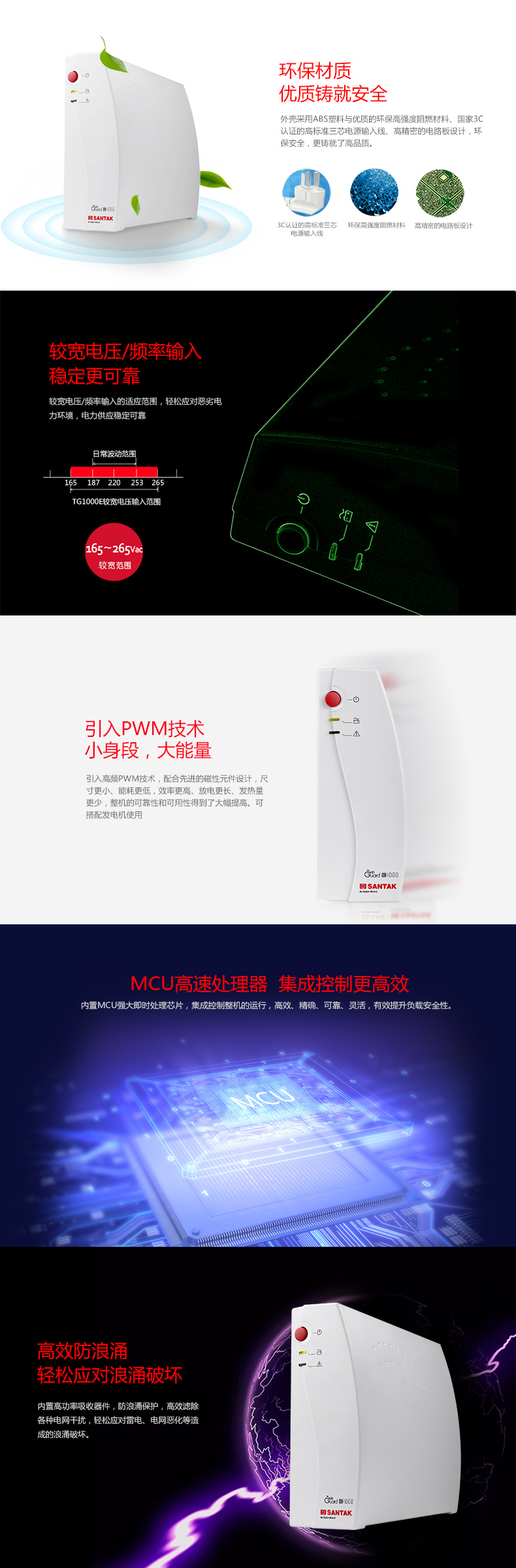 山特后备式TG-E1000系列UPS---美观时尚的“设备守护神”。TG-E1000 UPS功能强大,集智慧、安全、可靠 于一身,全面提升消费者在产品品质、观感、质感方面的使用体验。这款UPS针对中国市场电力环境优化设计,内置先进的MCU控制单元,使用环保的ABS塑料,做工精美,有效的解决5种常见电力问题:市电断电、电压下陷、浪涌、欠压、过压。TG-E500 UPS 小身段,大能量,守护个人和办公电脑、商务设备等硬件设备和数据的安全。